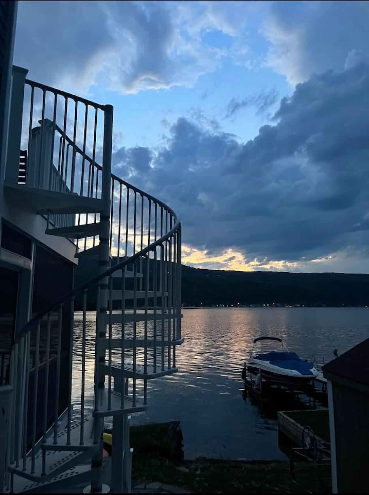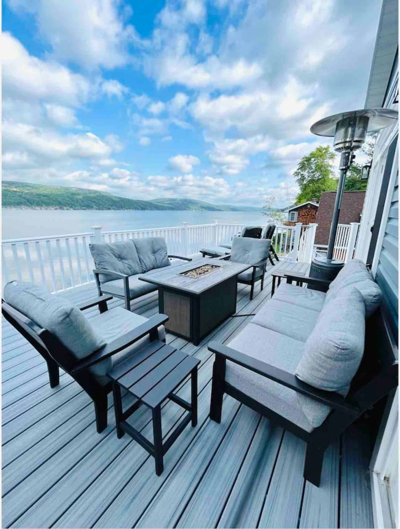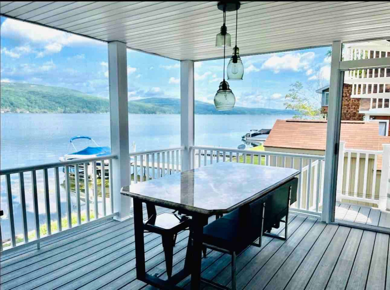 OUTDOOR LIVING: Quiet and private location on the east side of Canandaigua Lake with magnificent sunsets and panoramic views. Three levels: (1) patio level with Blackstone griddle, dining for 6, lake toys, and access to wood-burning firepit ready for marshmallow roasting with firewood provided and outdoor shower; (2) screened-in deck with dining for 14 people, gas firepit, sectional seating, ceiling fan/chandelier, and minifridge; then follow the beautiful spiral staircase to the (3) upper deck featuring dining for 6, large gas firepit seating area, heater for cooler nights and lounge chairs. There are two stand-up paddle boards, a one-person kayak, a tandem inflatable kayak, a three-person canoe, and a 4-person floating raft for you to enjoy, but note these may be used at your own risk. Life jackets of various sizes are provided.