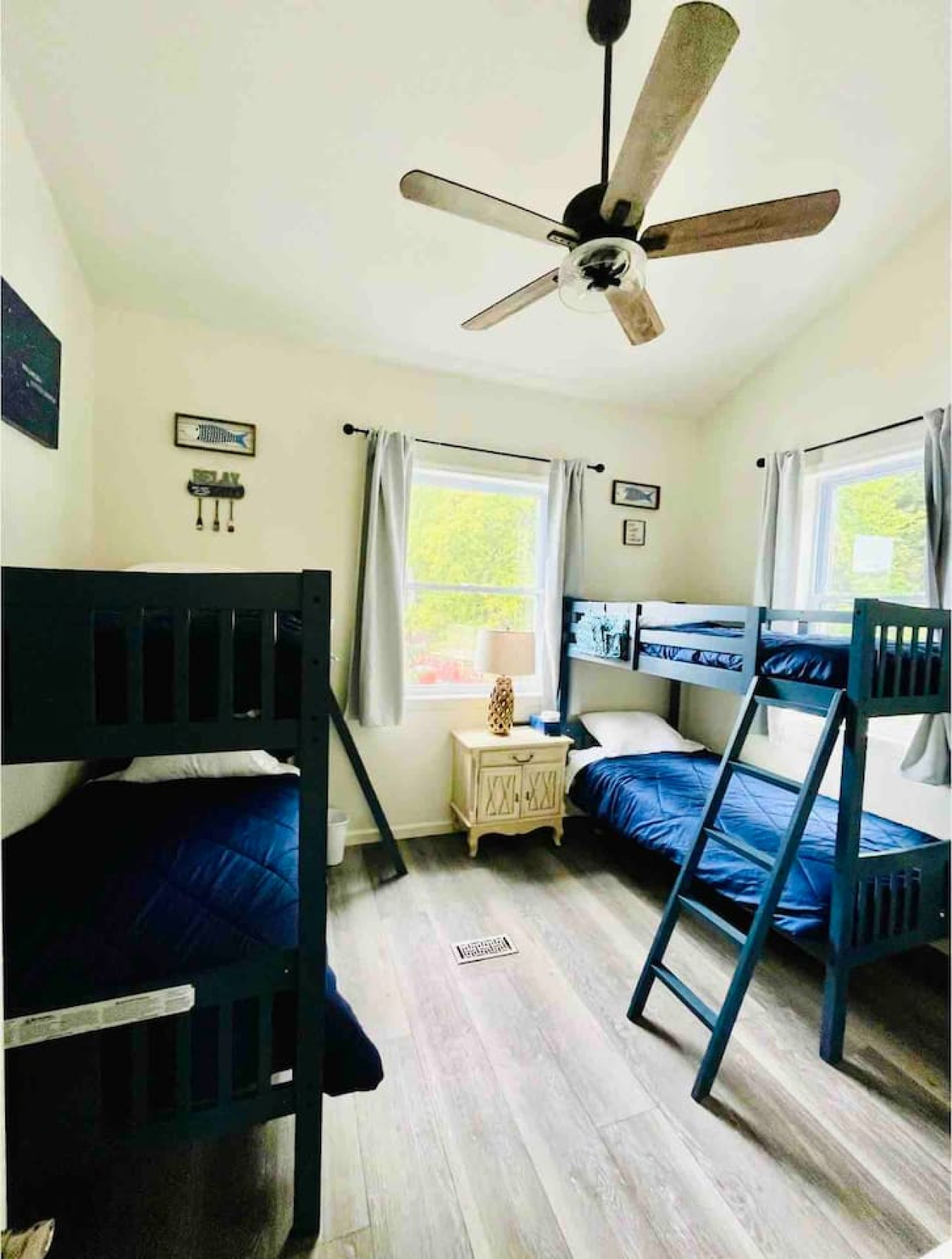 - 2nd FLOOR: Enormous 14-foot high cathedral ceilings and large windows to show off the spectacular water views! Living room open to upper-level deck with wine fridge, trendy hall bath with designer navy hexagon tile, bathtub and water fountain faucet; BR3 - Owners ensuite with queen canopy bed/Purple mattress and stunning glass-tiled bathroom; BR4 - queen bed storage bed and convertible sofa, BR5 - Two bunk beds (4 twin mattresses total)