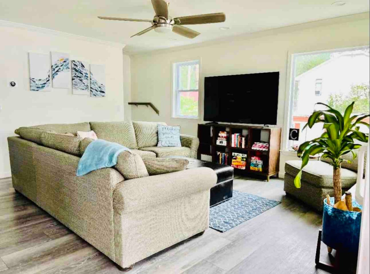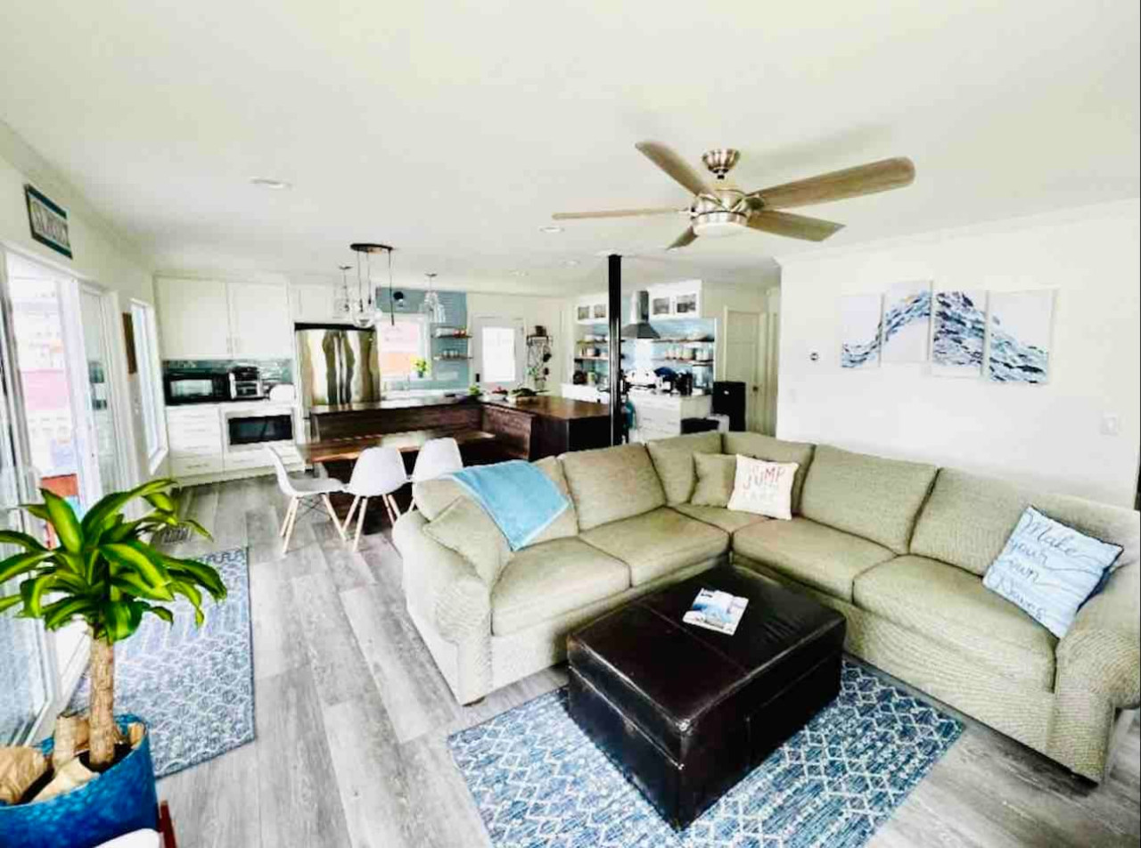 INDOOR LIVING: Two living rooms, 5 bedrooms all with ceiling fans, 3 full decorator's bathrooms. 1st FLOOR: Living room open to dining/kitchen and deck with a large Smart TV (includes streaming apps such as Netflix, Amazon Prime, Apple TV,