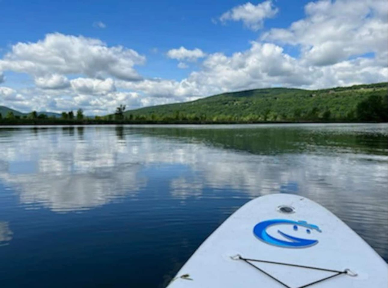 We're at the quiet end of the lake, so you won't get run over by a jet ski when you're paddle boarding, haha! Depending on time of year and water level, it can be shallow with lily pads/lotus flowers and sometimes seaweed and on occasion algae makes its way as in most lakes. Some summers can have a drought where levels are lower as most lakes. However, you can take the paddle boards out farther and have lots of fun swimming.