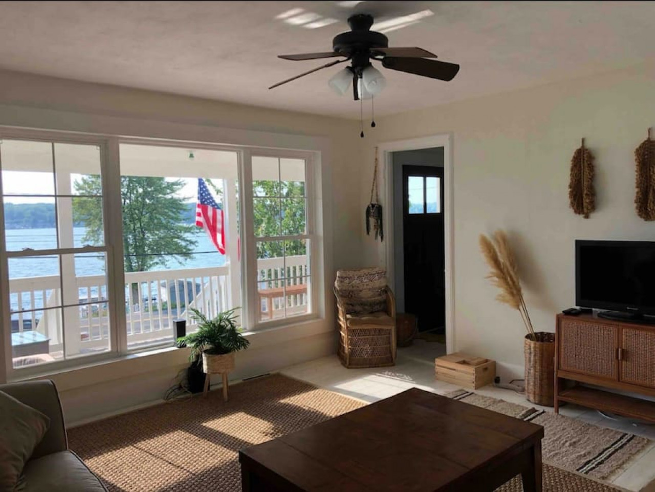 We love the character of our old colonial farmhouse on the lake! We love being in the east side of the lake, enjoying magnificent sunsets every night, and an extra hour of sunshine at the end of the day. We love being on the north end of the lake, close to town for dining and supplies. We love being just right up the street from the famous Shoreless Acres general store from yesteryear, and the yummy options at Serious Food. We love our morning coffee on the front porch while enjoying the view of the lake. We love the coziness of our lakeside lot, and walking the hill behind our house for extra special views of the entire lake!