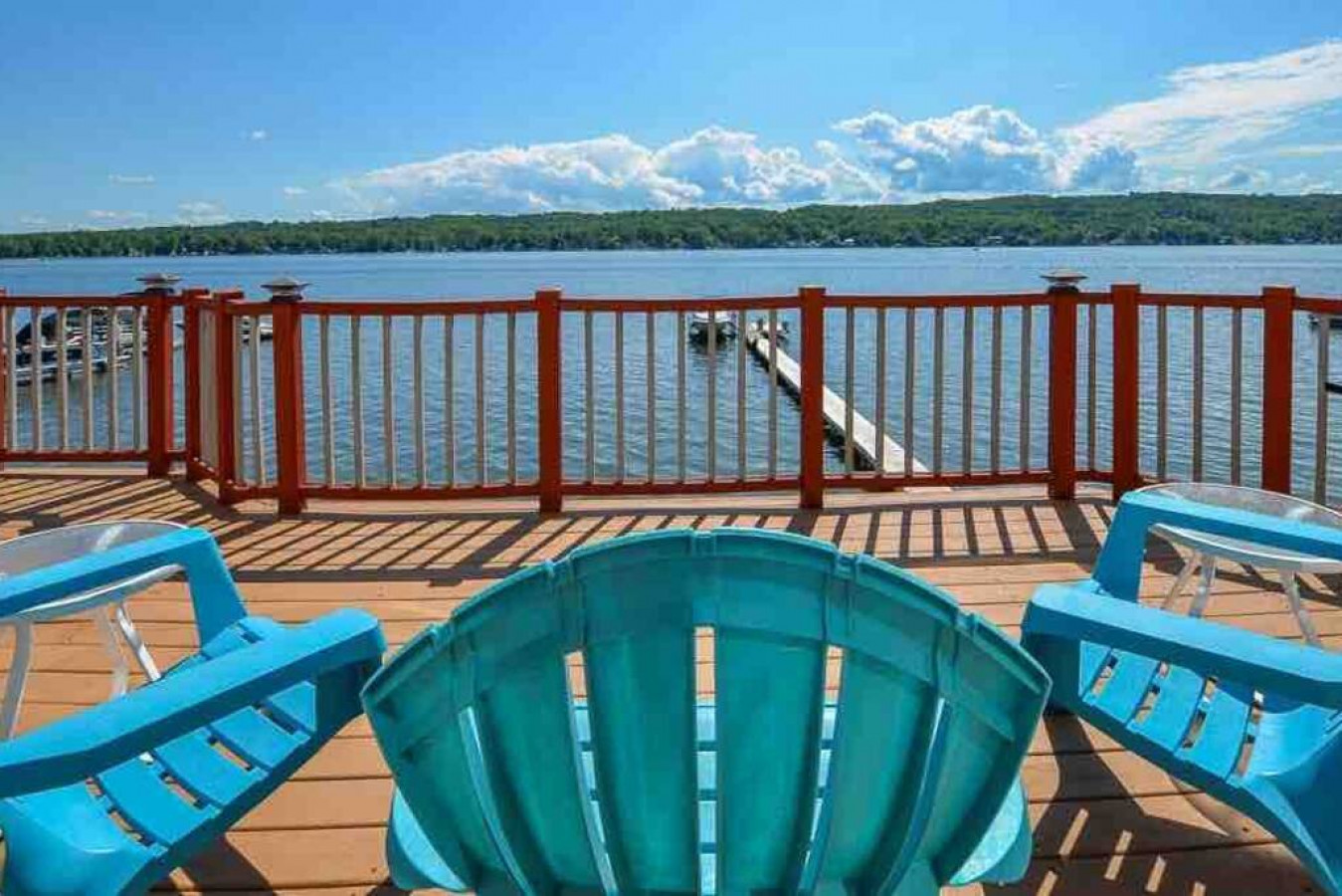 Recently renovated, this beautiful lake home offers sunrise views that will take your breath away. Inside, wood flooring and lake views span the length of the great room. Plush furniture adorned in cool shades of blues offer the perfect spot to curl up and relax with a glass of Finger Lakes wine, or a cup of coffee and a book.