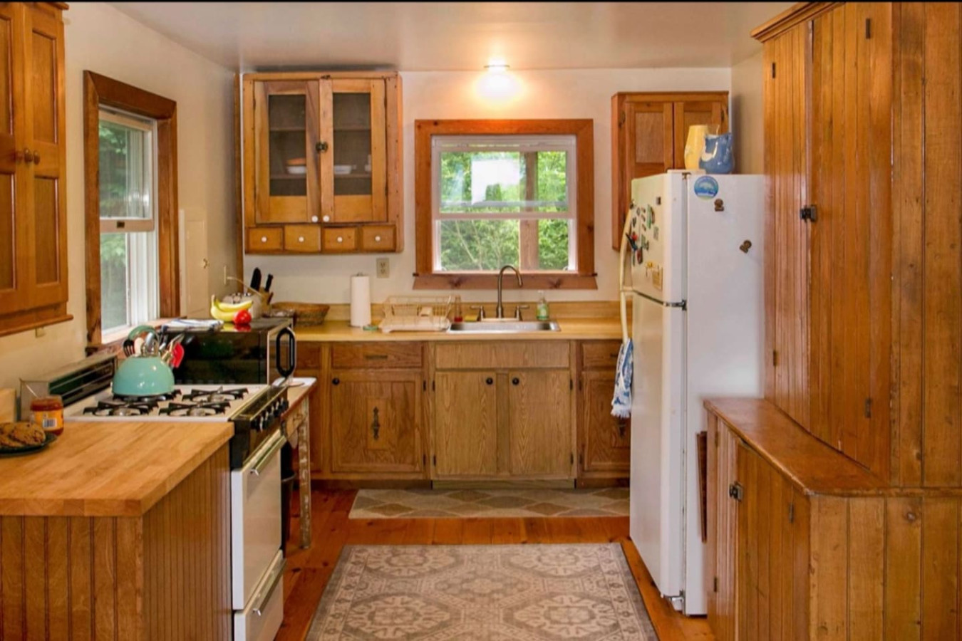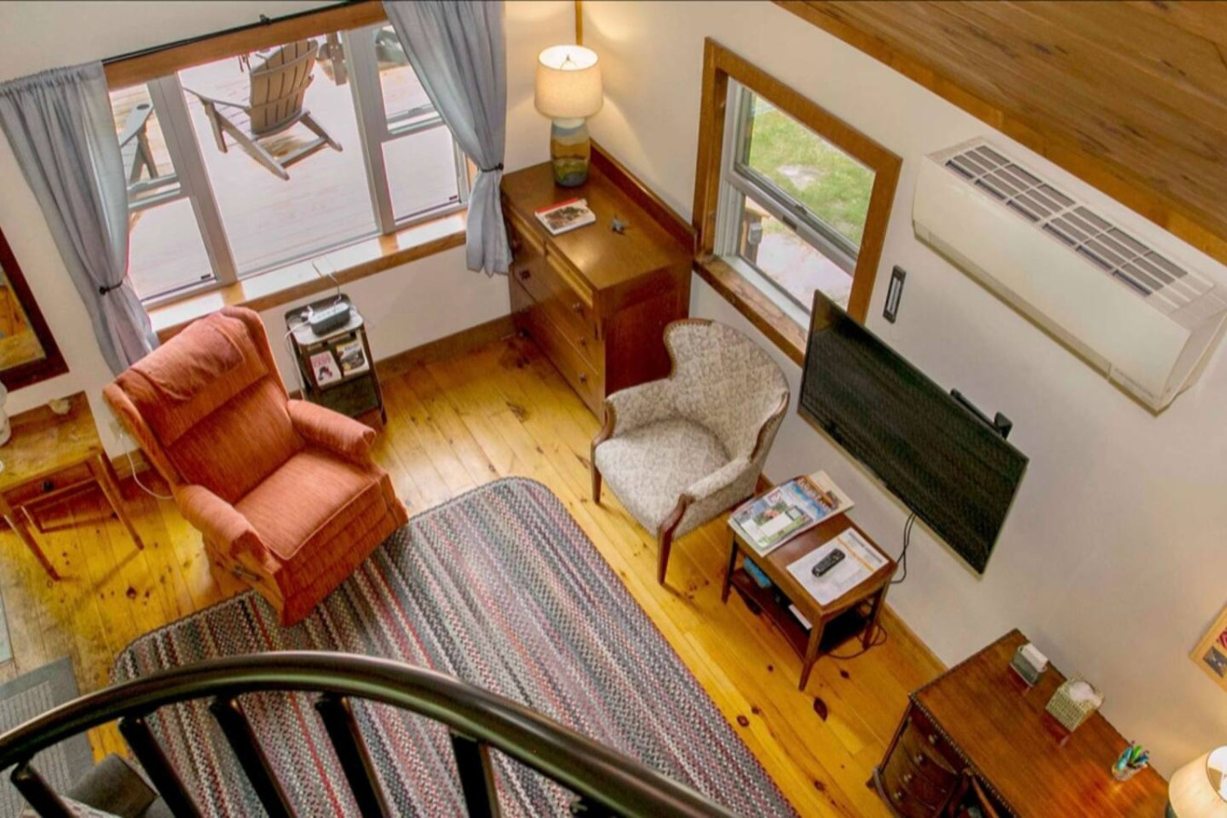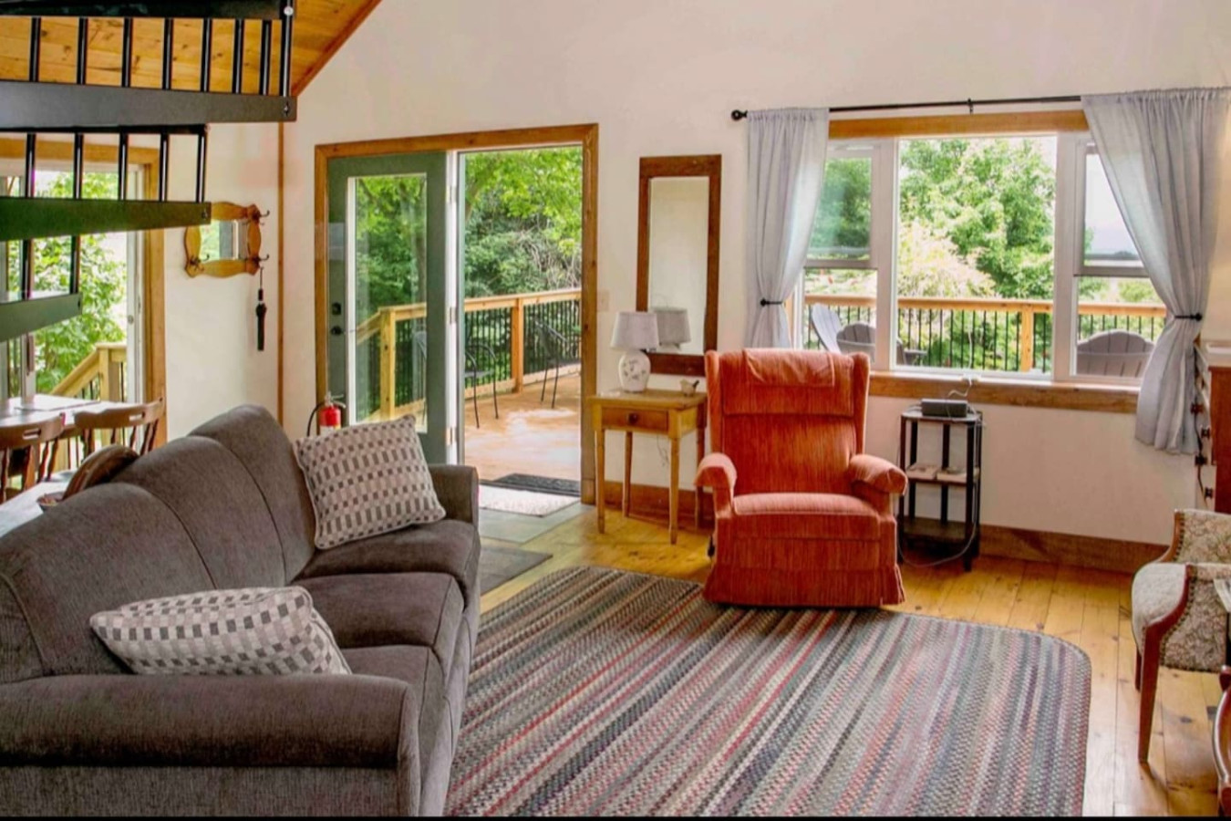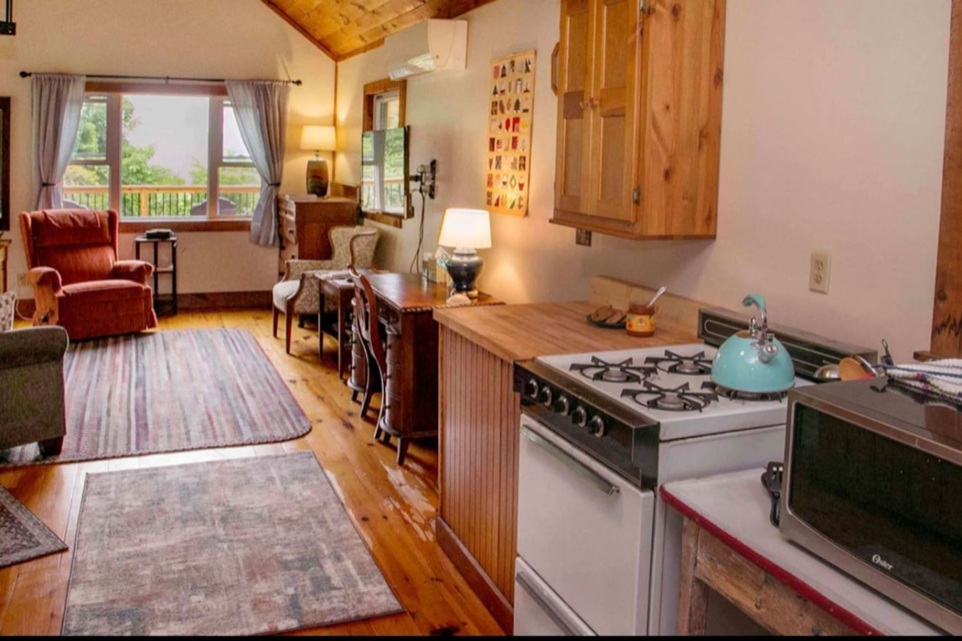 This cozy cabin features a spacious loft with a queen-size bed with a half bath, ideal for curling up after a day of outdoor adventures. Downstairs, you’ll find a full bathroom, a well-equipped kitchenette, and a welcoming living space that opens to a porch with seating – the perfect spot to sip your morning coffee or enjoy the sounds of nature.